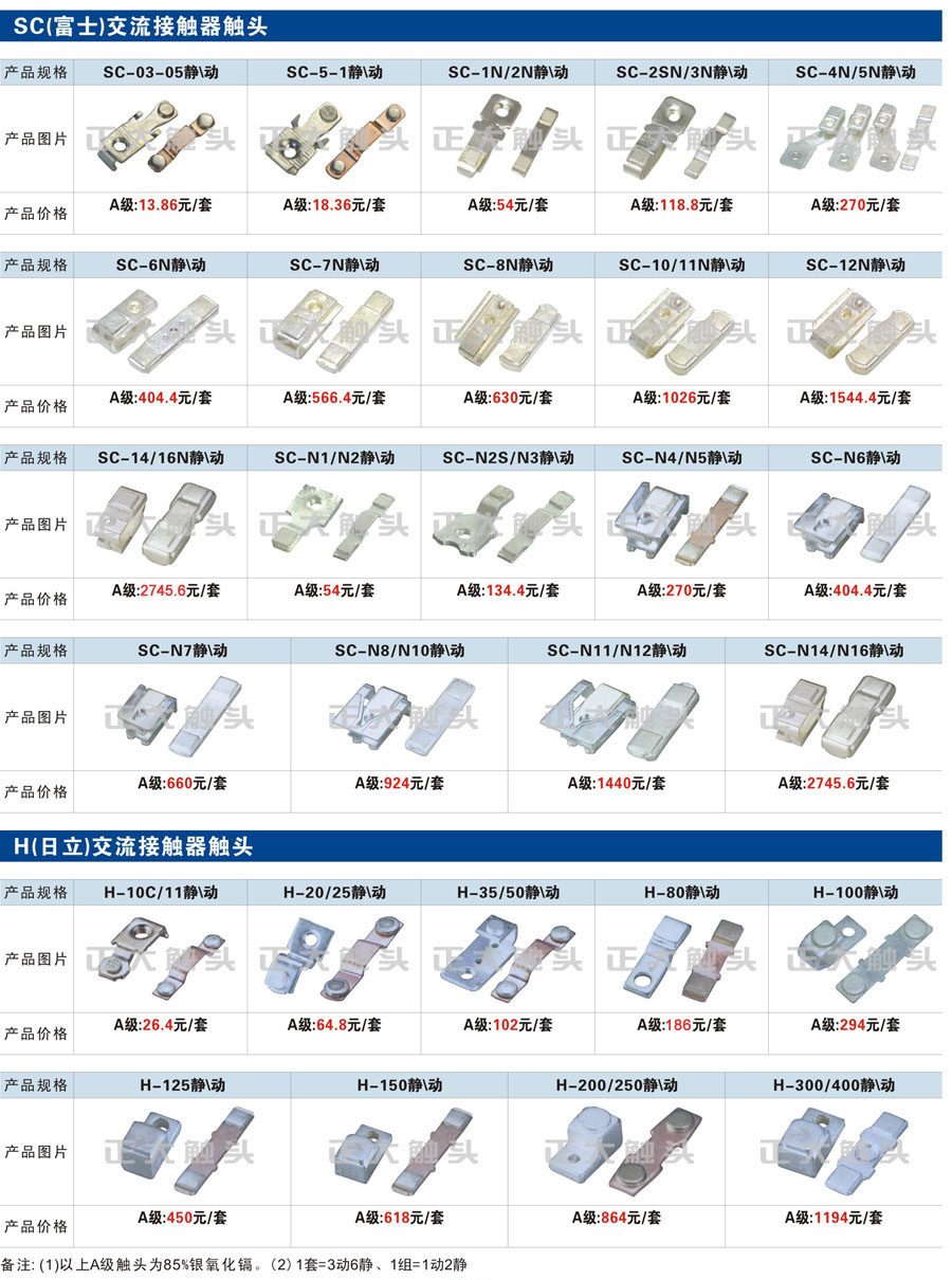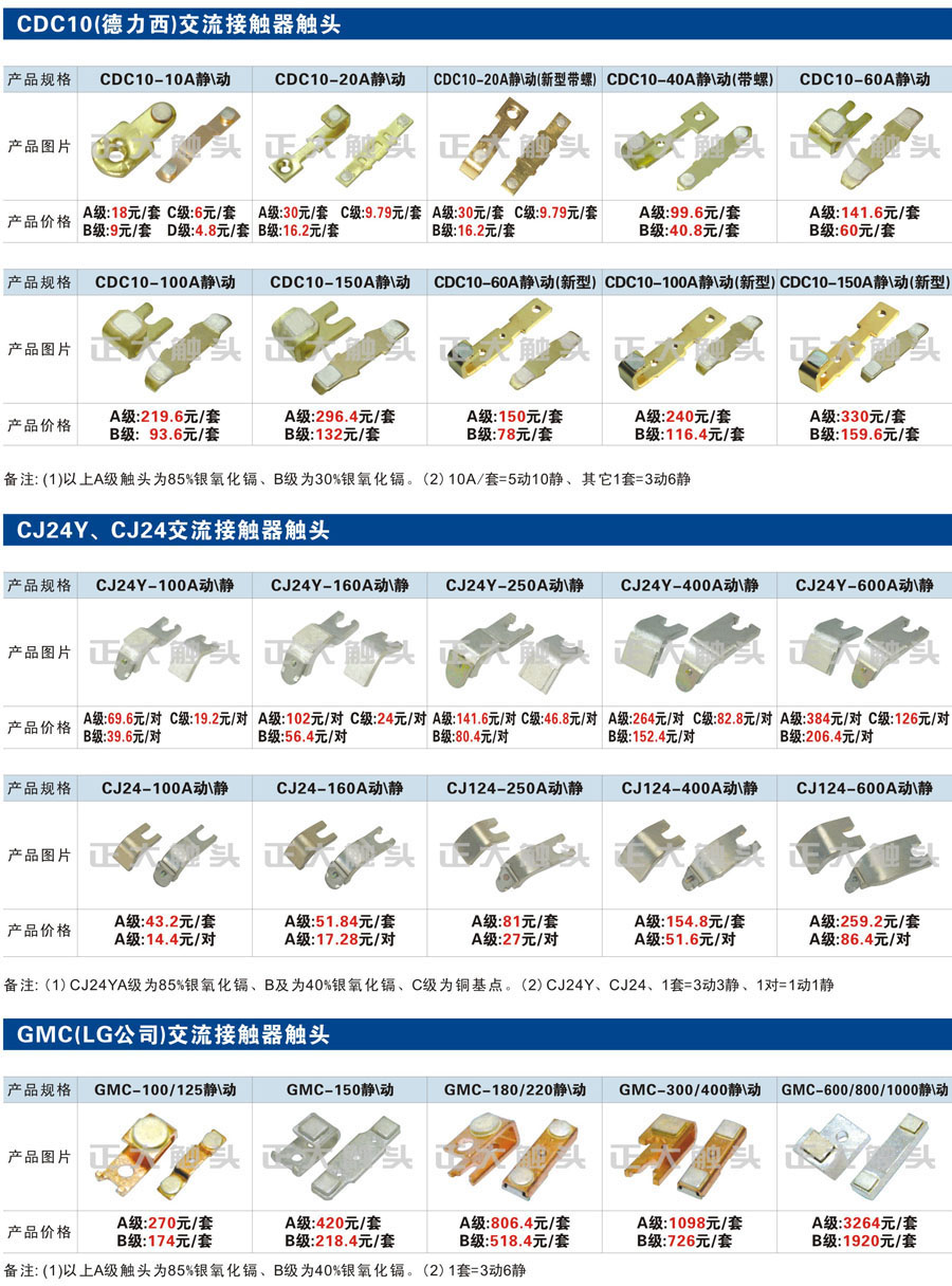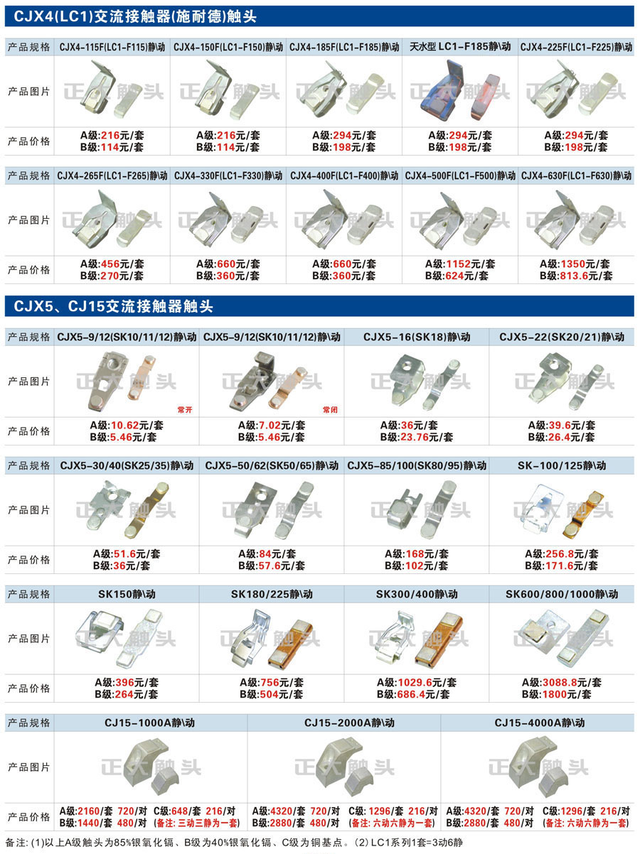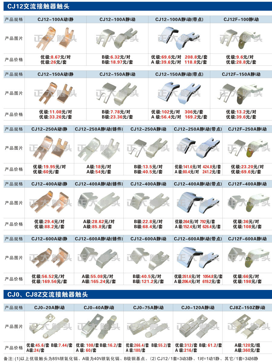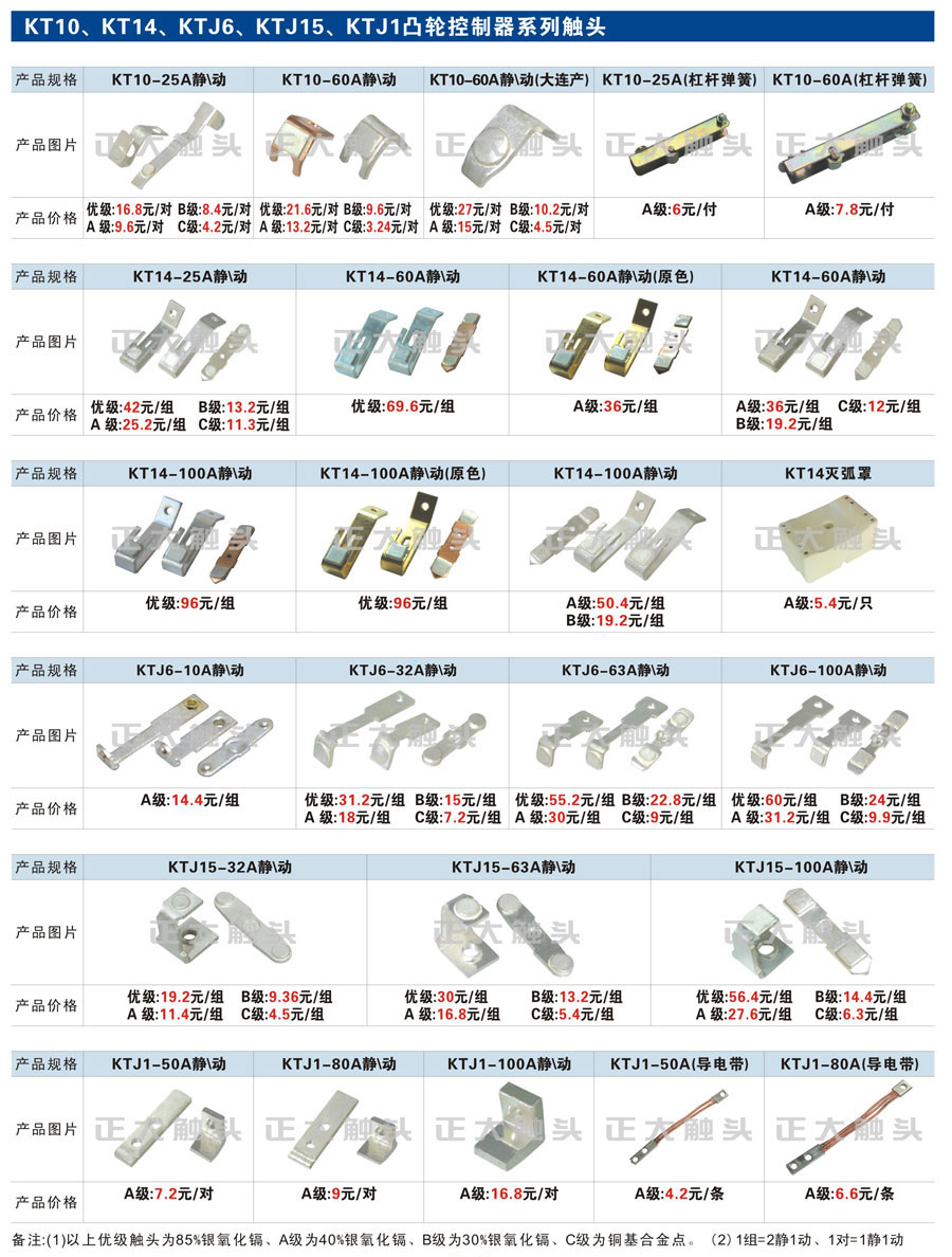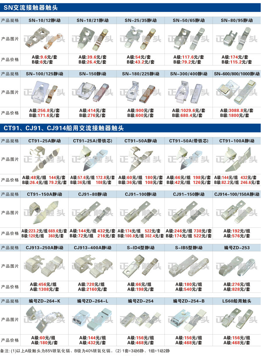 触头元件作为电器开关核心元件,主要用于接触器,继电器,断路器,凸轮控制器,补偿器,行程开关,脚踏开关,辅助开关等。开云体育电气现生产CJT1,CJX1,CJX2,CJX4,CJX5,CJX8(B系列)CJ20,CJ40,CJ12,CJ15,CJ24,CJ24Y,CJ0,CDC10,CJ91,CT91,CJ913,CJ914,CJ3,CJ8Z交流接触器触头,CZ0,CZ1,CZ3,CZ17,CZ18,CG5直流接触器触头,QJ3,QC83补偿器触头,凸轮控制器,主令触头,KT10,KT12,KT14,KTJ1,KTJ5,KTJ6,KTJ15(QT5),LK1,LK17,LK18,THQ1,TQKT等;断路器触头DW10,DW16,DW15,DW17,DW45,DZ10,DZ20,内燃机触头,矿用触头,叉车,吊车触头,JYN1,JYN2,ZN28,SN10,VS1,梅花触头等。进口ABB系列AF,EH,EK,富士SC系列,日立H系列,施耐德LC1系列,西门子3TF,3TB系列,LG公司(LS产电)GMC系列,三菱机电SN系列。与国内正泰,德力西,天正,人民等,国外ABB,施耐德,西门子,富士,三菱等厂家电气配套。